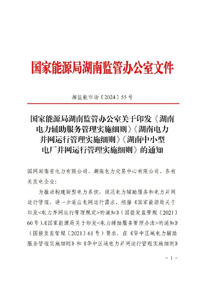 9月11日,国家能源局湖南监管办公室发布《湖南电力辅助服务管理实施细则》《湖南电力并网运行管理实施细则》《湖南中小型电厂并网运行管理实施细则》的通知》。