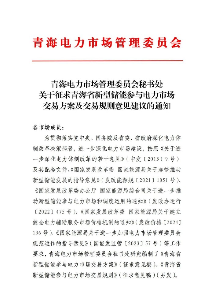9月18日,青海电力市场管理委员会秘书处关于征求青海省新型储能参与电力市场交易方案及规则等意见建议的通知。
