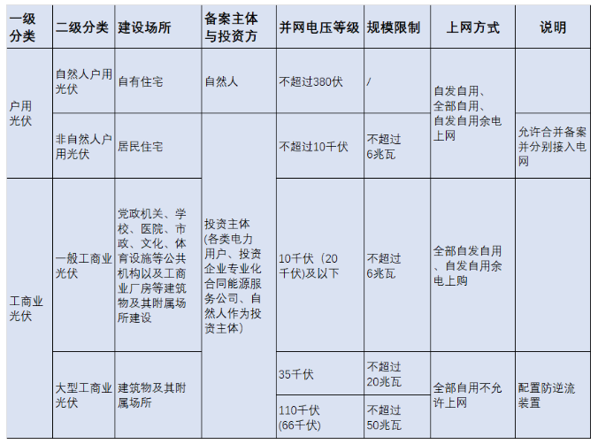 对分布式光伏项目做了更细致的分类,共分四类,且不同类型项目,并网模式不同,规模限制不同,大幅提高了分布式光伏项目的容量与并网电压。具体如下表所示: