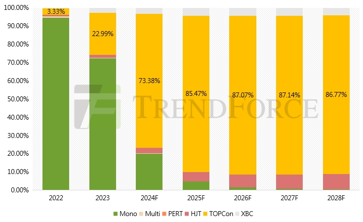 根据TrendForce集邦咨询预测,以N型技术为核心的光伏电池组件产品迎来了更大的市场需求,到2024年年底电池片产能约1201GW,其中,N型电池片产能约1026GW,占比约85%。凭借深厚技术积累,捷泰率先完成N型电池研发,成为全球首家实现N型电池大规模量产的专业化电池企业,引领和推动行业技术升级变革。
