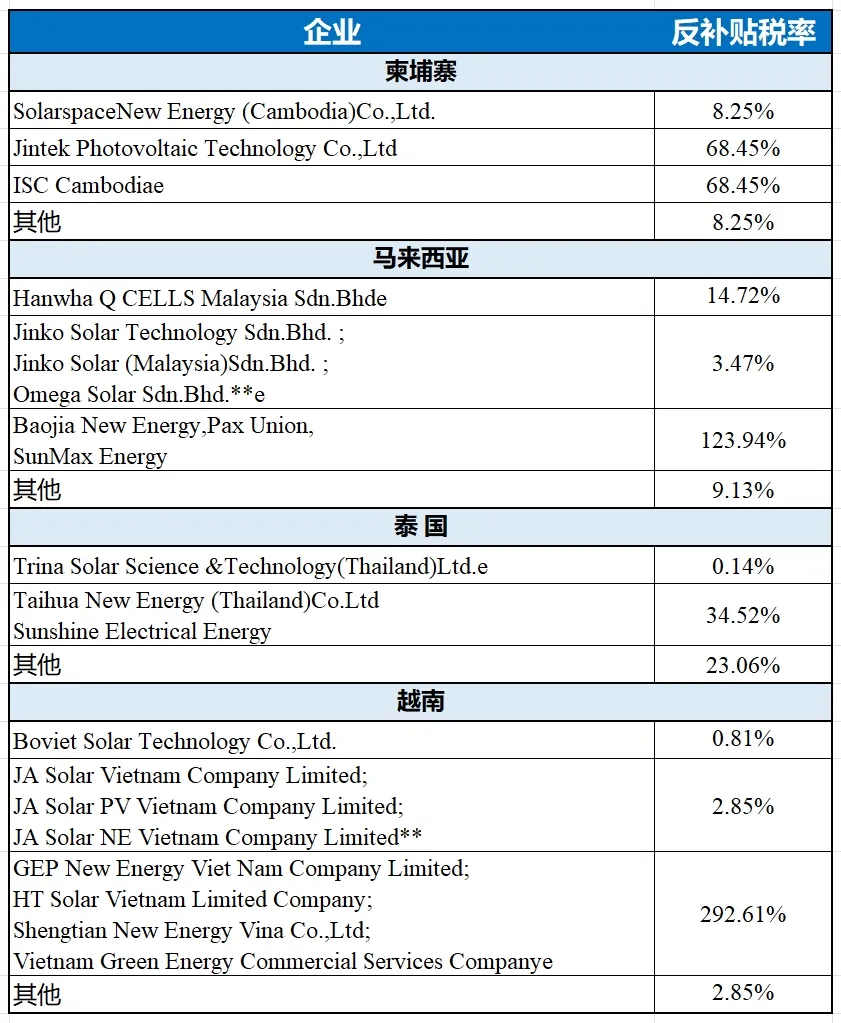 全球化趋势下,多国出台贸易保护政策,鼓励本土光伏制造业发展。11月29日,美国商务部公布其对东南亚四国柬埔寨、马来西亚、泰国和越南晶体光伏电池(无论是否组装成组件)反倾销税调查的初步肯定性裁定:四国反倾销税率范围在0-271.28%。