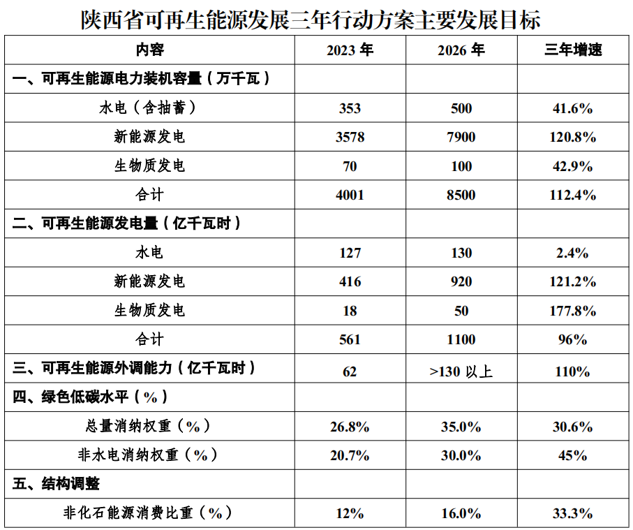 每年竞争10GW可再生能源建设规模,到2026年建成榆林20GW级;延安、渭南10GW级,全省20个GW级可再生能源发展示范县。