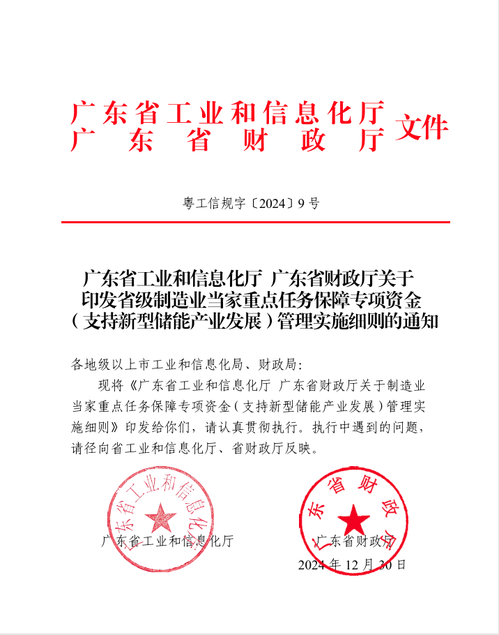 2024年12月30日,为加强和规范对制造业当家重点任务保障专项资金的管理,提高资金使用效益,广东省工业和信息化厅、广东省财政厅发布《广东省工业和信息化厅广东省财政厅关于制造业当家重点任务保障专项资金(支持新型储能产业发展)管理实施细则》。