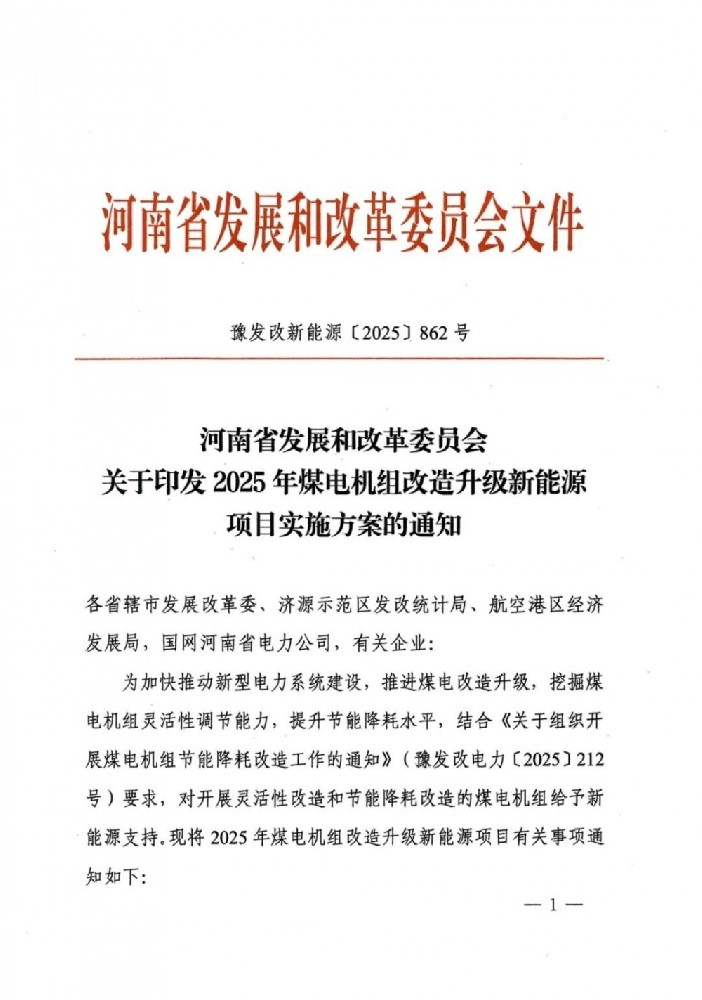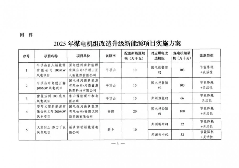 近日,河南省发展和改革委员会发布关于印发2025年煤电机组改造升级新能源项目实施方案的通知。文件表示,根据煤电机组改造升级计划,按照“能改尽改、能建尽建原则,本次印发实施2025年煤电机组改造升级新能源项目共477万千瓦,均为风电项目。