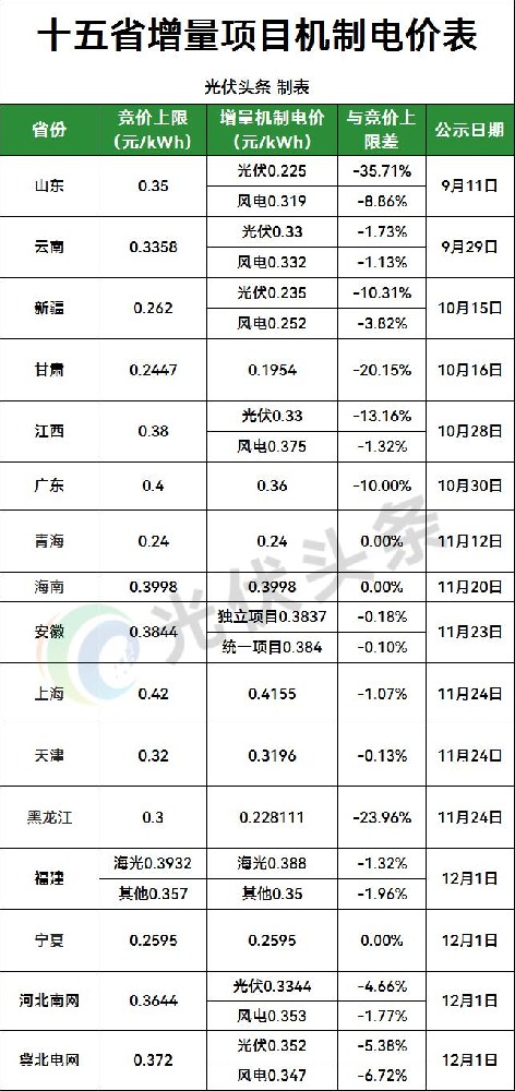 截至目前,已经有15个省市公布机制电价竞价结果,其中宁夏、青海、海南3省为上限出清。