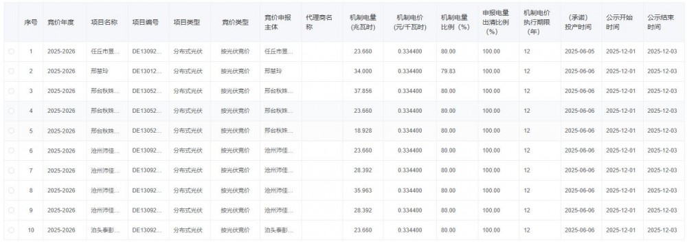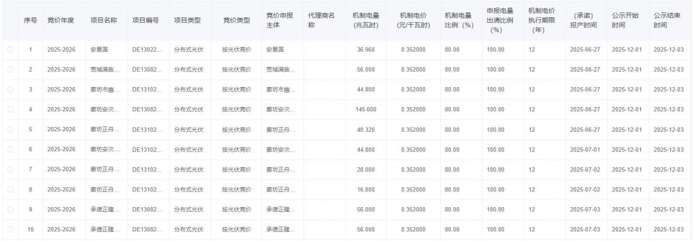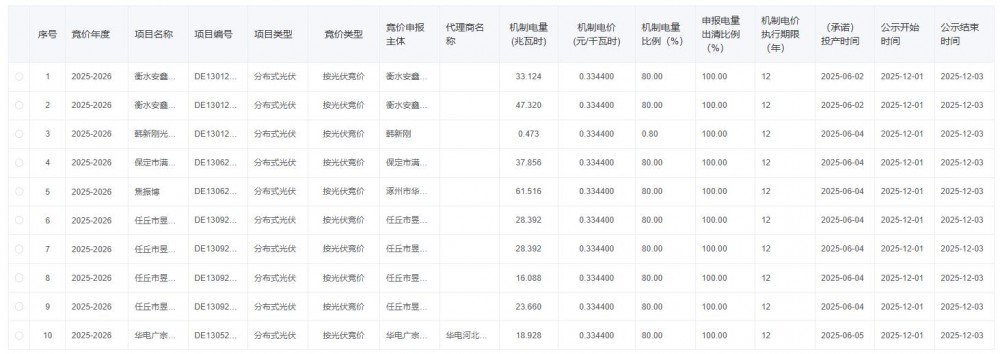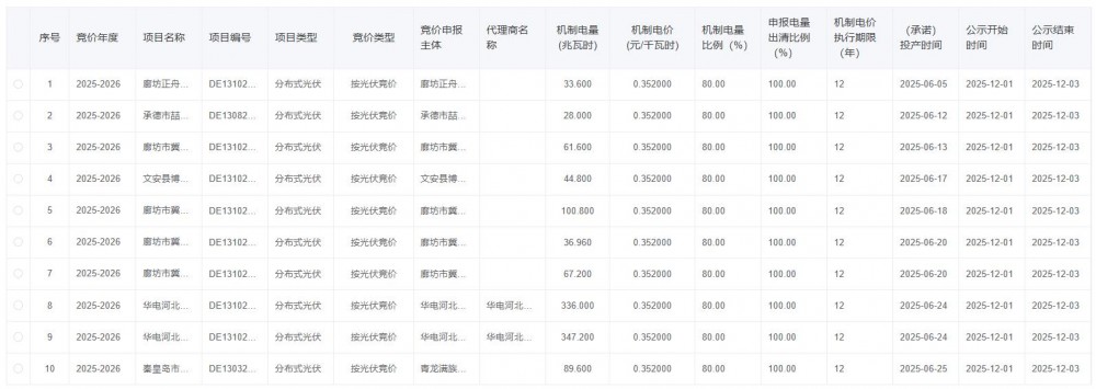 12月1日,国网新能源云公示2026年度河北增量新能源项目机制电价竞价结果。