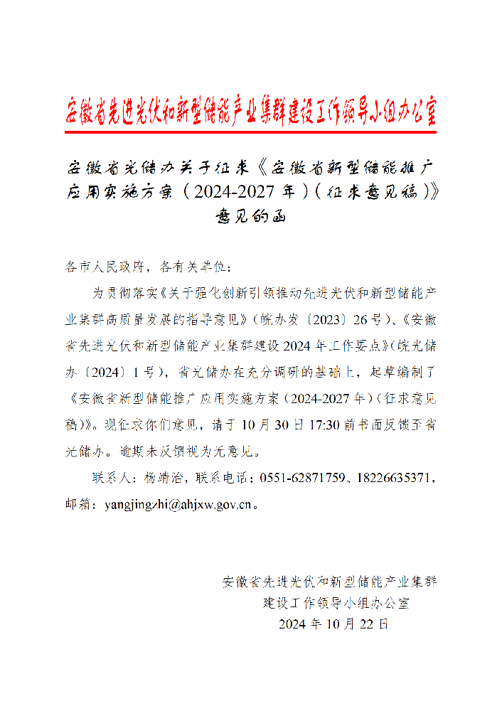 为贯彻落实《关于强化创新引领推动先进光伏和新型储能产业集群高质量发展的指导意见》(皖办发〔2023〕26号)、《安徽省先进光伏和新型储能产业集群建设2024年工作要点》(皖光储办〔2024〕1号),我厅会同相关部门共同研究编制了《安徽省新型储能推广应用实施方案(2024-2027年)》(征求意见稿),现向社会公开征求意见。